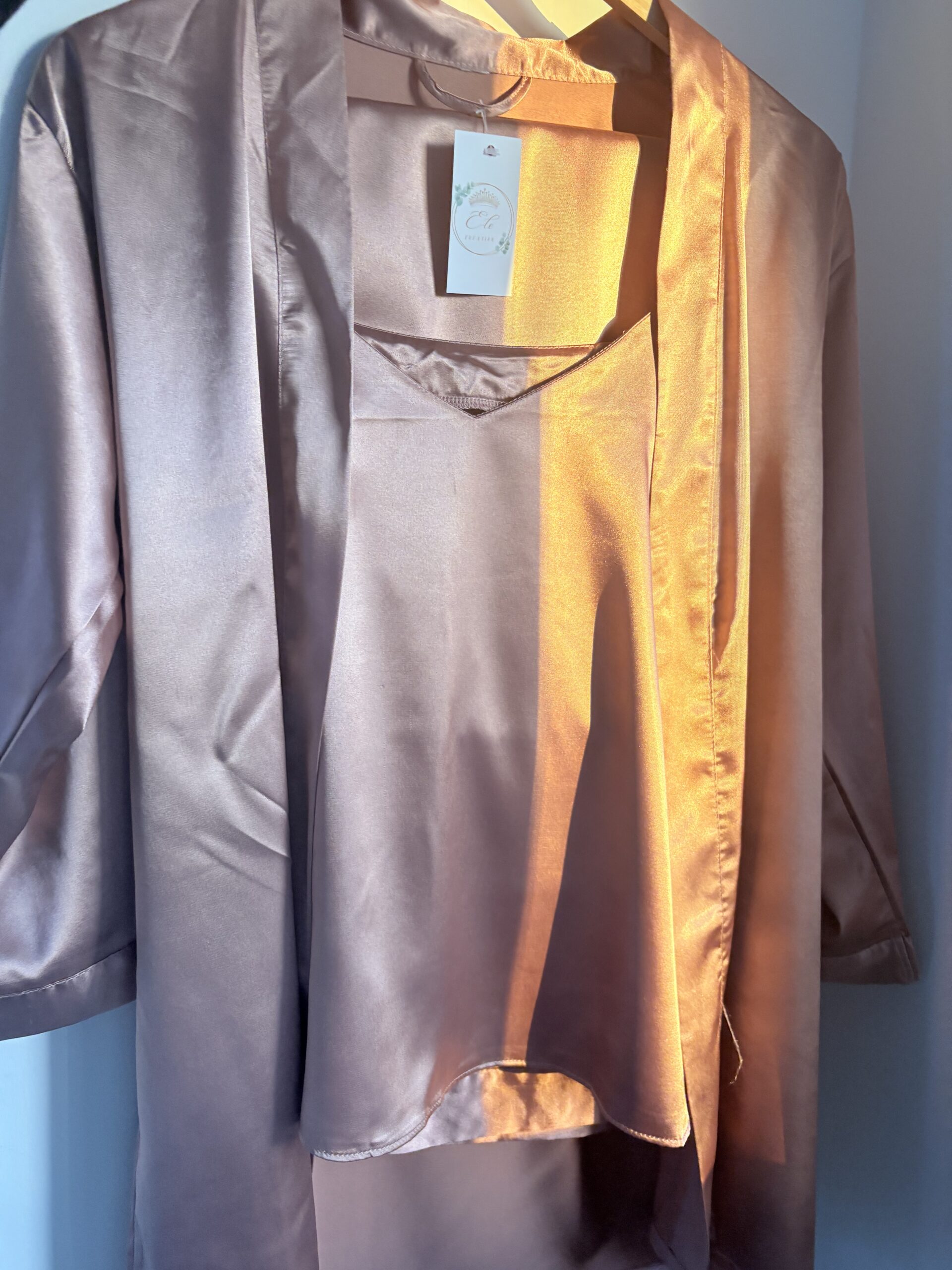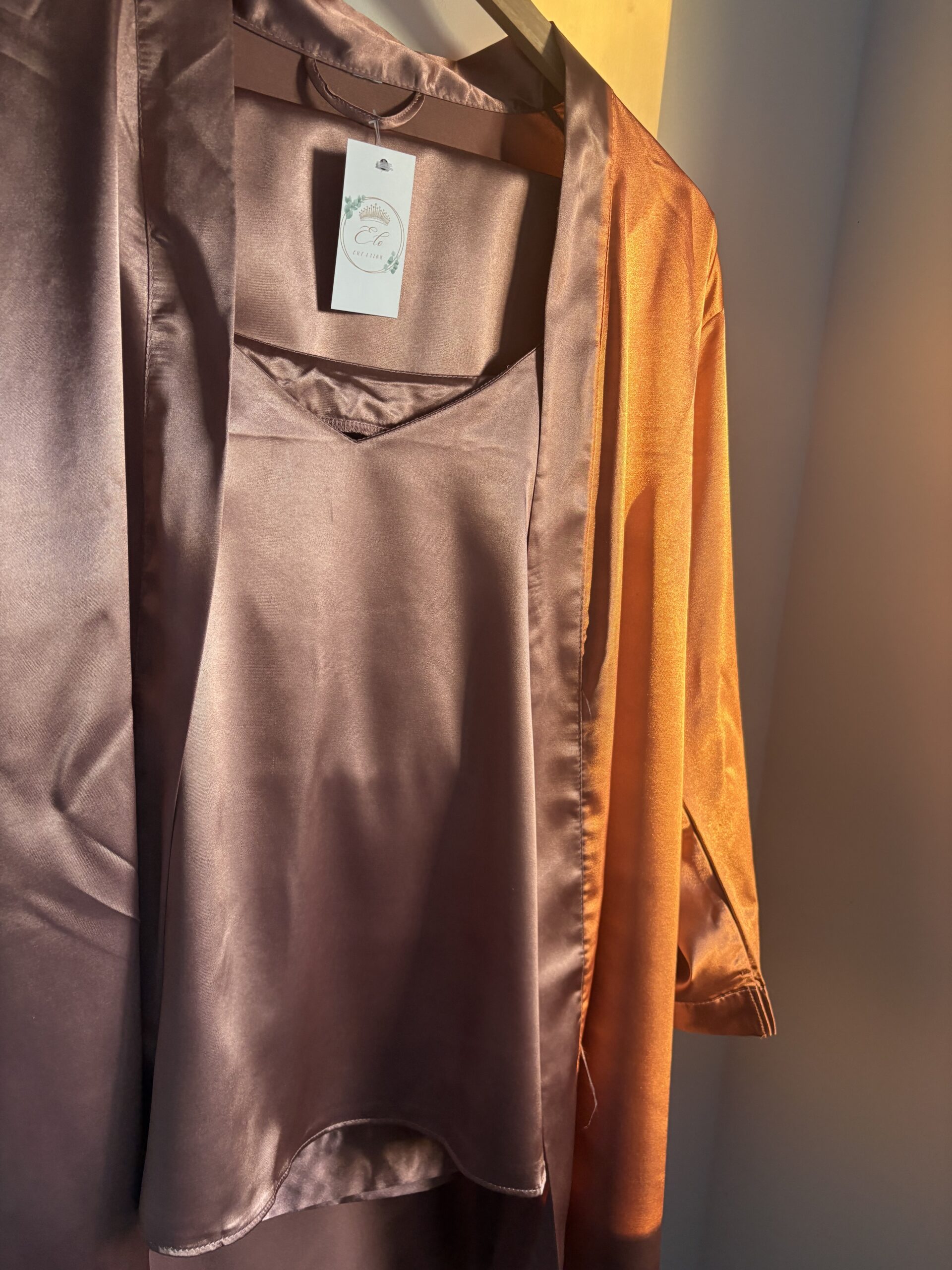 Ensemble pyjama satiné couleur Moka. (Kimono-débardeur-pantalon)